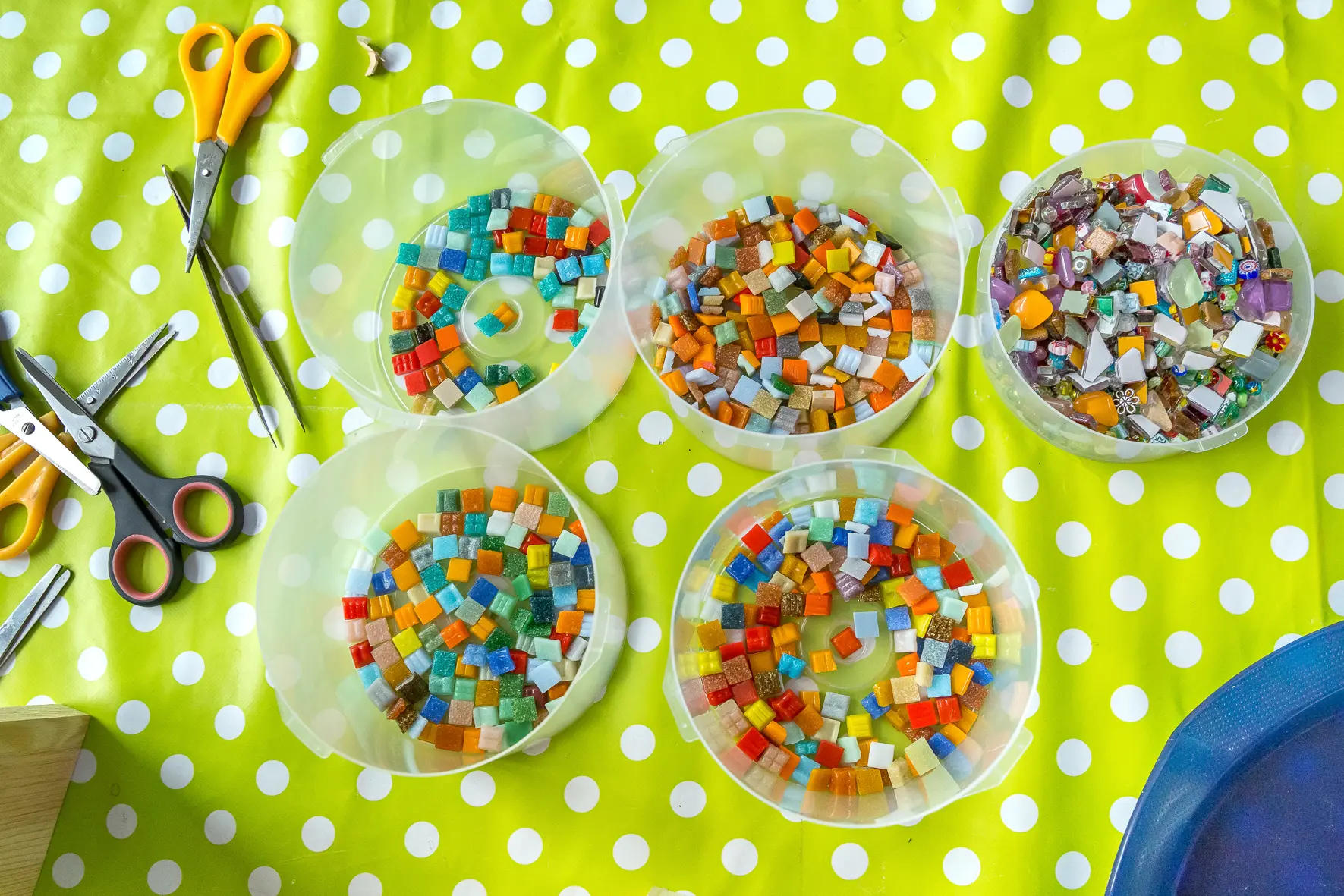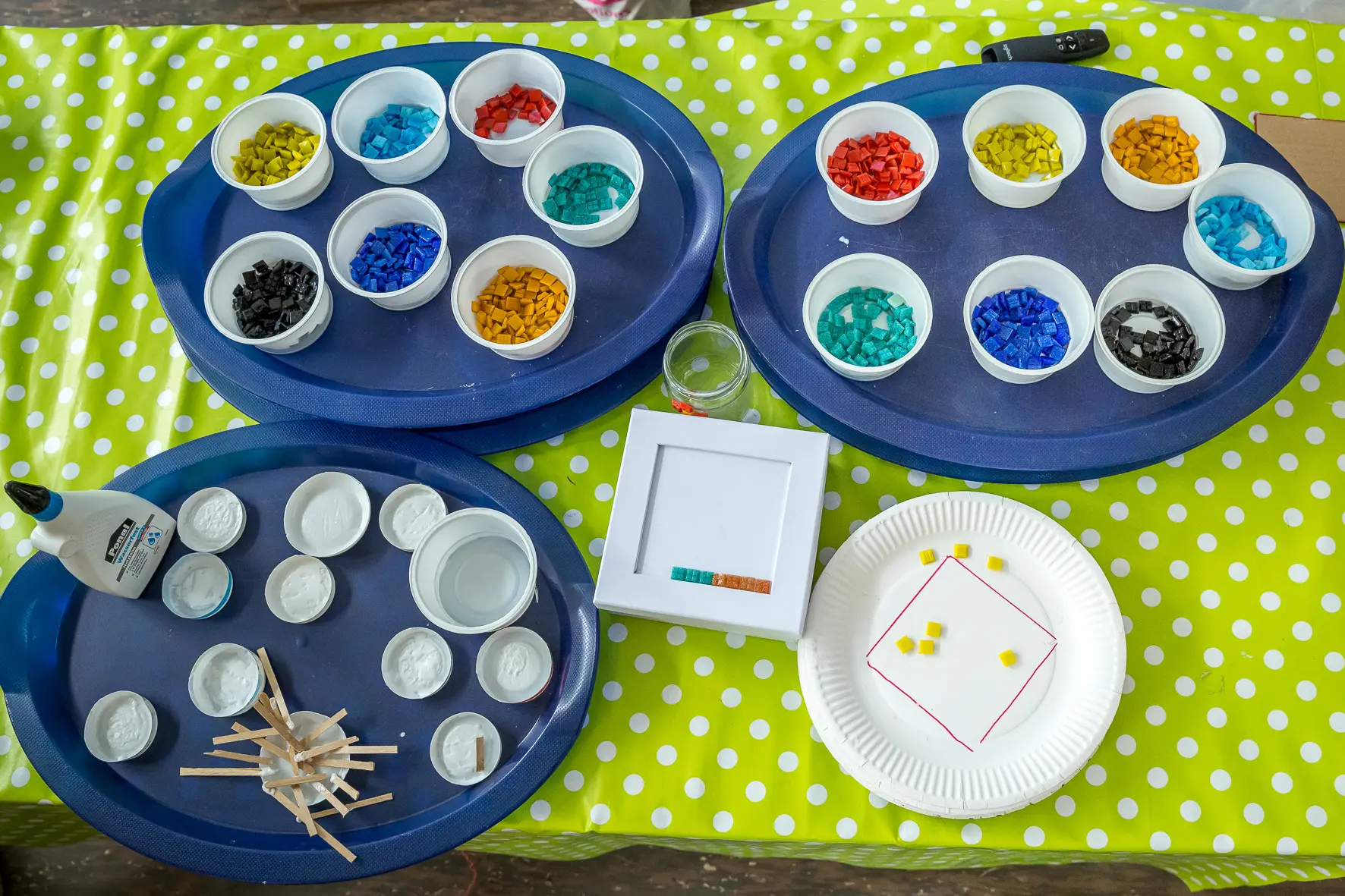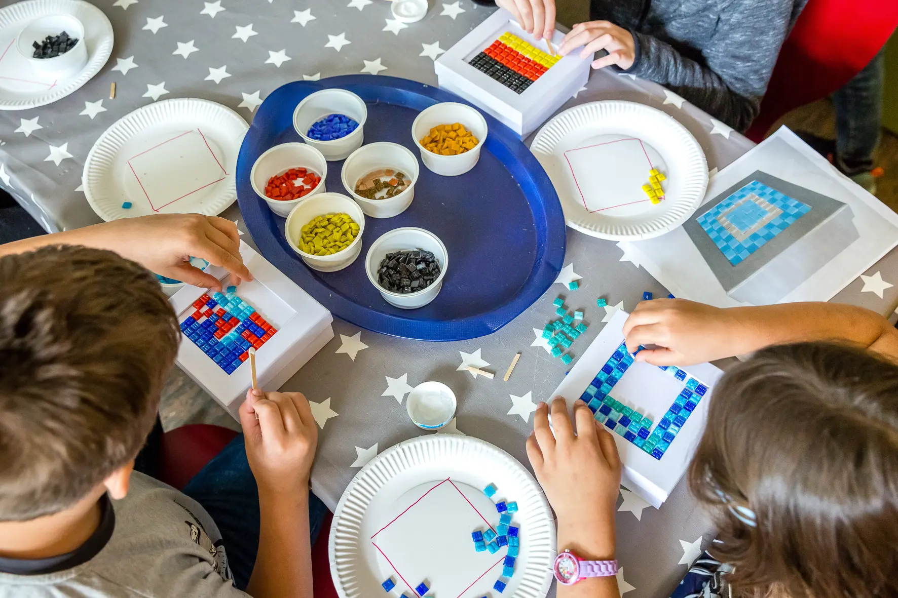 An diesem Vormittag erlernen die Kinder nicht nur eine künstlerische Technik, sondern erleben beim Planen und Gestalten ihres Motivs eine sehr harmonische Zeit. Mit kleinen Glassteinchen können auf einem Schatzholzkästchen ein farbenfohes Mosaik gestalten und Ideen entwickeln, was sie in ihre Schatztruhe noch legen möchten.